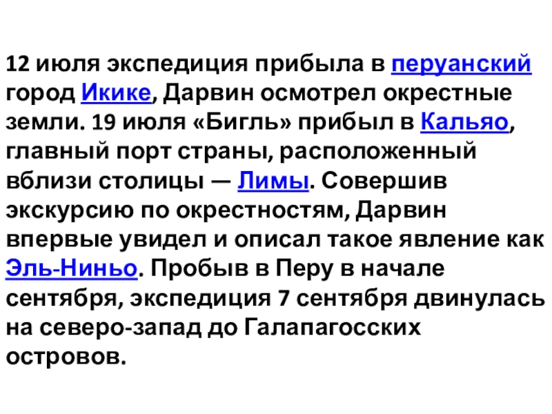 земли. 19 июля «Бигль» прибыл в Кальяо, главный порт страны, расположенный вблизи столицы — Лимы. Совершив экскурсию по окрестностям, Дарвин впервые увидел и описал такое явление как Эль-Ниньо. Пробыв в Перу в начале сентября, экспедиция 7 сентября двинулась на северо-запад до Галапагосских островов.