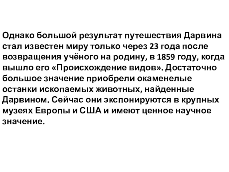 года после возвращения учёного на родину, в 1859 году, когда вышло его «Происхождение видов». Достаточно большое значение приобрели окаменелые останки ископаемых животных, найденные Дарвином. Сейчас они экспонируются в крупных музеях Европы и США и имеют ценное научное значение.