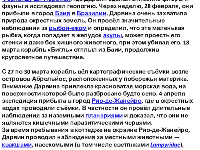 описание флоры и фауны и исследовал геологию. Через неделю, 28 февраля, они прибыли в город Баия в Бразилии. Дарвина очень захватила природа окрестных земель. Он провёл значительные наблюдения за рыбой-ежом и определил, что эта маленькая рыбка, когда попадает в желудок акулы, может проесть его стенки и даже бок хищного животного, при этом убивая его. 18 марта корабль «Бигль» отплыл из Баии, продолжив кругосветное путешествие.