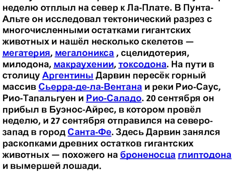 север к Ла-Плате. В Пунта-Альте он исследовал тектонический разрез с многочисленными остатками гигантских животных и нашёл несколько скелетов — мегатерия, мегалоникса , сцелидотерия, милодона, макраухении, токсодона. На пути в столицу Аргентины Дарвин пересёк горный массив Сьерра-де-ла-Вентана и реки Рио-Саус, Рио-Тапальгуен и Рио-Саладо. 20 сентября он прибыл в Буэнос-Айрес, в котором провёл неделю, и 27 сентября отправился на северо-запад в город Санта-Фе. Здесь Дарвин занялся раскопками древних остатков гигантских животных — похожего на броненосца глиптодона и вымершей лошади.