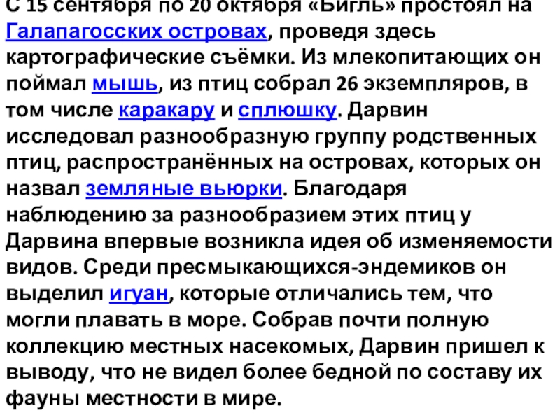 проведя здесь картографические съёмки. Из млекопитающих он поймал мышь, из птиц собрал 26 экземпляров, в том числе каракару и сплюшку. Дарвин исследовал разнообразную группу родственных птиц, распространённых на островах, которых он назвал земляные вьюрки. Благодаря наблюдению за разнообразием этих птиц у Дарвина впервые возникла идея об изменяемости видов. Среди пресмыкающихся-эндемиков он выделил игуан, которые отличались тем, что могли плавать в море. Собрав почти полную коллекцию местных насекомых, Дарвин пришел к выводу, что не видел более бедной по составу их фауны местности в мире.