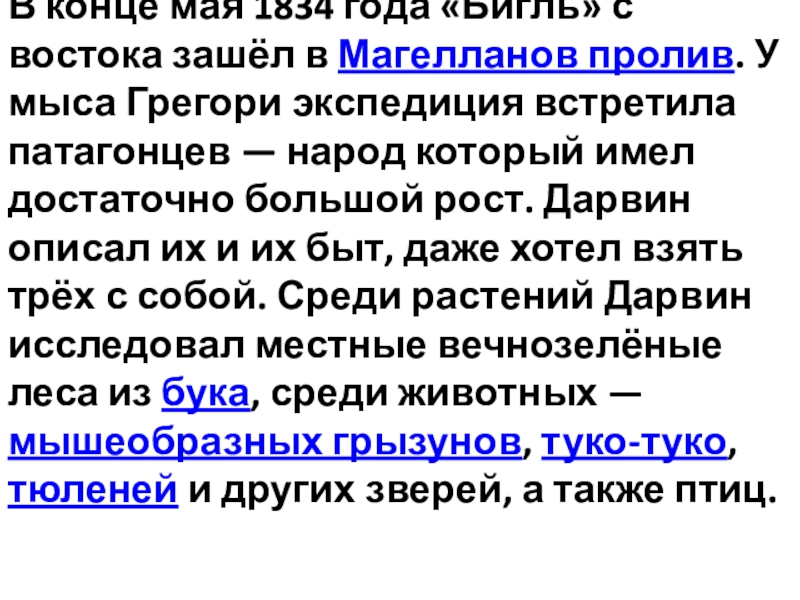 пролив. У мыса Грегори экспедиция встретила патагонцев — народ который имел достаточно большой рост. Дарвин описал их и их быт, даже хотел взять трёх с собой. Среди растений Дарвин исследовал местные вечнозелёные леса из бука, среди животных — мышеобразных грызунов, туко-туко, тюленей и других зверей, а также птиц.