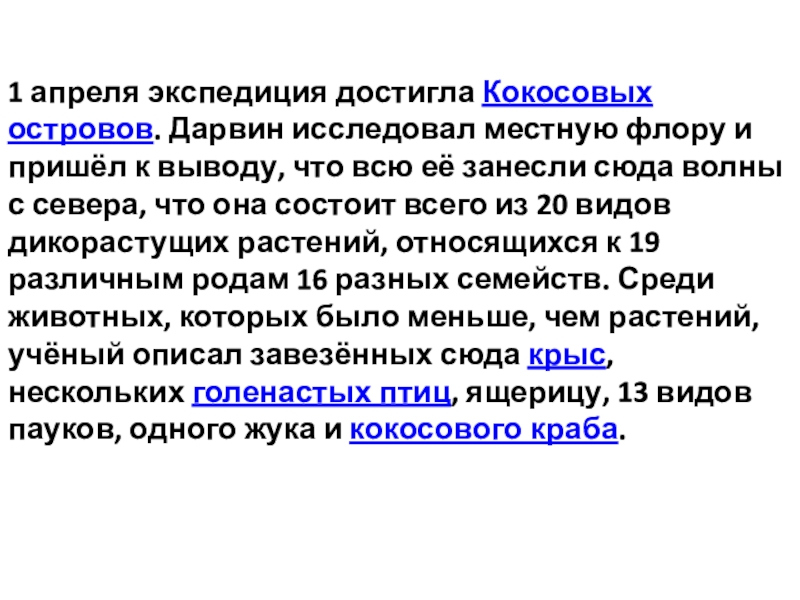 Слайд 311 апреля экспедиция достигла Кокосовых островов. Дарвин исследовал местную флору и