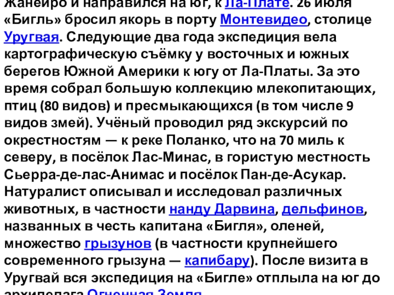 на юг, к Ла-Плате. 26 июля «Бигль» бросил якорь в порту Монтевидео, столице Уругвая. Следующие два года экспедиция вела картографическую съёмку у восточных и южных берегов Южной Америки к югу от Ла-Платы. За это время собрал большую коллекцию млекопитающих, птиц (80 видов) и пресмыкающихся (в том числе 9 видов змей). Учёный проводил ряд экскурсий по окрестностям — к реке Поланко, что на 70 миль к северу, в посёлок Лас-Минас, в гористую местность Сьерра-де-лас-Анимас и посёлок Пан-де-Асукар. Натуралист описывал и исследовал различных животных, в частности нанду Дарвина, дельфинов, названных в честь капитана «Бигля», оленей, множество грызунов (в частности крупнейшего современного грызуна — капибару). После визита в Уругвай вся экспедиция на «Бигле» отплыла на юг до архипелага Огненная Земля.