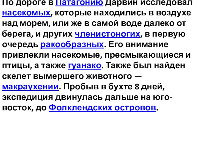 над морем, или же в самой воде далеко от берега, и других членистоногих, в первую очередь ракообразных. Его внимание привлекли насекомые, пресмыкающиеся и птицы, а также гуанако. Также был найден скелет вымершего животного — макраухении. Пробыв в бухте 8 дней, экспедиция двинулась дальше на юго-восток, до Фолклендских островов.