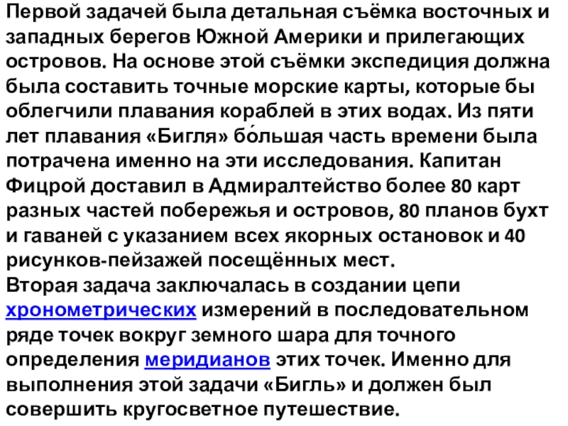 и прилегающих островов. На основе этой съёмки экспедиция должна была составить точные морские карты, которые бы облегчили плавания кораблей в этих водах. Из пяти лет плавания «Бигля» бо́льшая часть времени была потрачена именно на эти исследования. Капитан Фицрой доставил в Адмиралтейство более 80 карт разных частей побережья и островов, 80 планов бухт и гаваней с указанием всех якорных остановок и 40 рисунков-пейзажей посещённых мест.