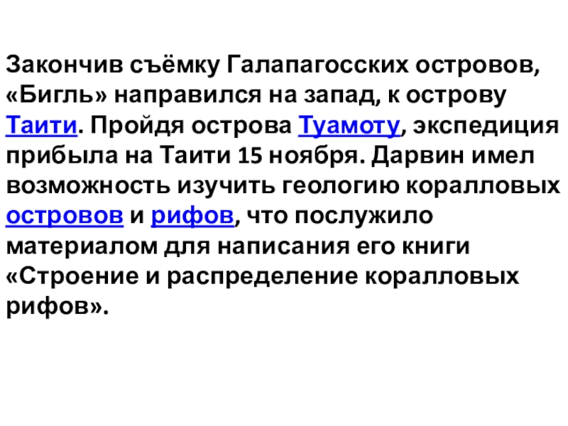 Слайд 29Закончив съёмку Галапагосских островов, «Бигль» направился на запад, к острову Таити.