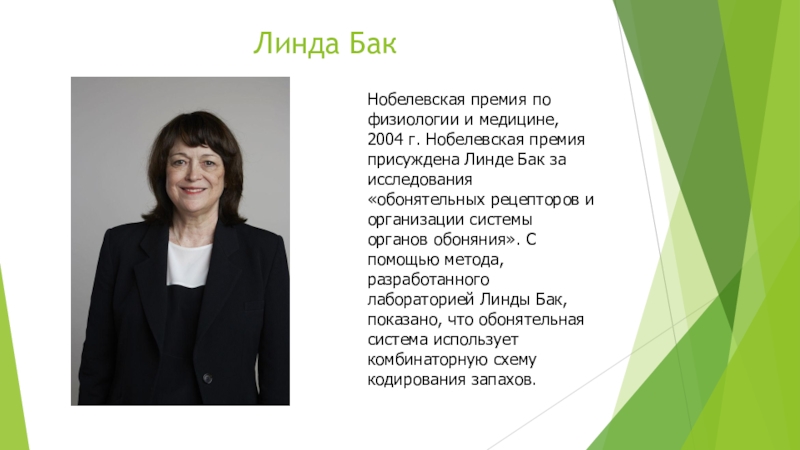 присуждена Линде Бак за исследования «обонятельных рецепторов и организации системы органов обоняния». С помощью метода, разработанного лабораторией Линды Бак, показано, что обонятельная система использует комбинаторную схему кодирования запахов.