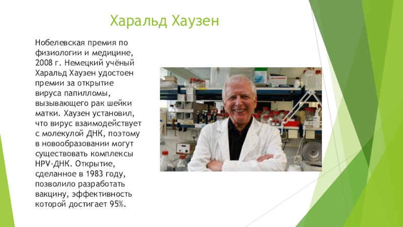 Харальд Хаузен удостоен премии за открытие вируса папилломы, вызывающего рак шейки матки. Хаузен установил, что вирус взаимодействует с молекулой ДНК, поэтому в новообразовании могут существовать комплексы HPV-ДНК. Открытие, сделанное в 1983 году, позволило разработать вакцину, эффективность которой достигает 95%.