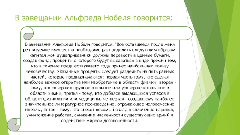 Слайд 4В завещании Альфреда Нобеля говорится: