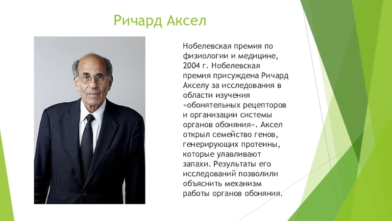 присуждена Ричард Акселу за исследования в области изучения «обонятельных рецепторов и организации системы органов обоняния». Аксел открыл семейство генов, генерирующих протеины, которые улавливают запахи. Результаты его исследований позволили объяснить механизм работы органов обоняния.