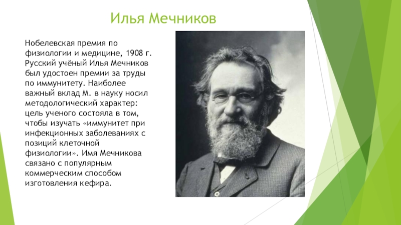 Илья Мечников был удостоен премии за труды по иммунитету. Наиболее важный вклад М. в науку носил методологический характер: цель ученого состояла в том, чтобы изучать «иммунитет при инфекционных заболеваниях с позиций клеточной физиологии». Имя Мечникова связано с популярным коммерческим способом изготовления кефира.