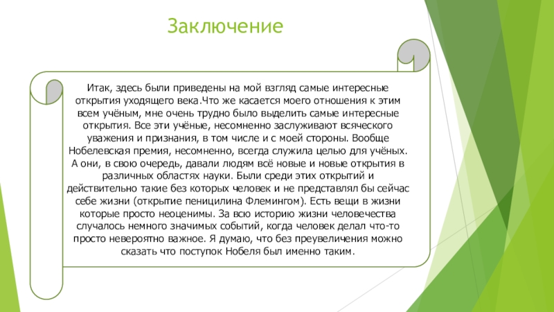 века.Что же касается моего отношения к этим всем учёным, мне очень трудно было выделить самые интересные открытия. Все эти учёные, несомненно заслуживают всяческого уважения и признания, в том числе и с моей стороны. Вообще Нобелевская премия, несомненно, всегда служила целью для учёных. А они, в свою очередь, давали людям всё новые и новые открытия в различных областях науки. Были среди этих открытий и действительно такие без которых человек и не представлял бы сейчас себе жизни (открытие пеницилина Флемингом). Есть вещи в жизни которые просто неоценимы. За всю историю жизни человечества случалось немного значимых событий, когда человек делал что-то просто невероятно важное. Я думаю, что без преувеличения можно сказать что поступок Нобеля был именно таким.