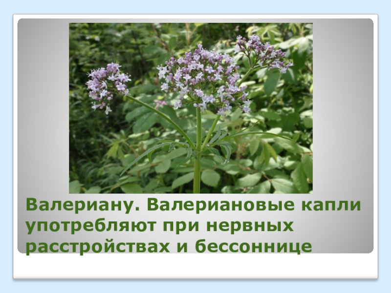 Слайд 13Валериану. Валериановые капли употребляют при нервных расстройствах и бессоннице