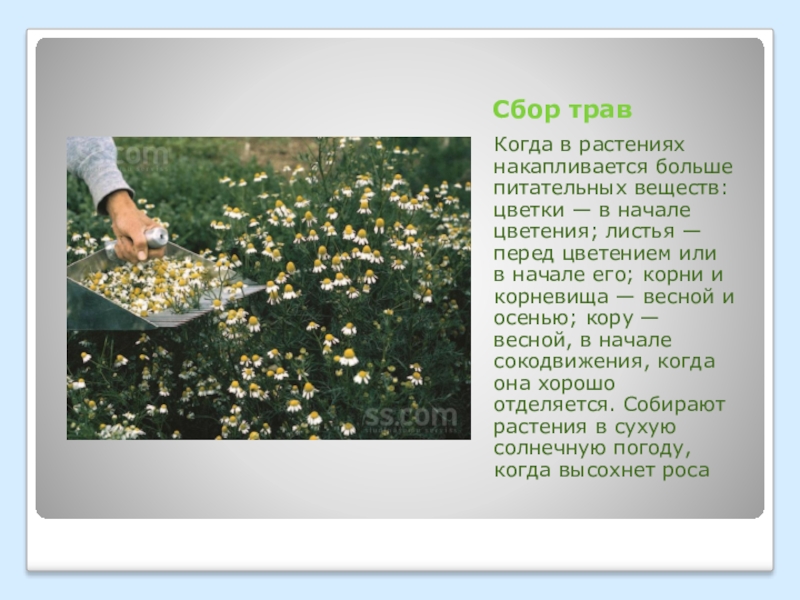 Сбор травКогда в растениях накапливается больше питательных веществ: цветки — в начале цветения; листья — перед цветением