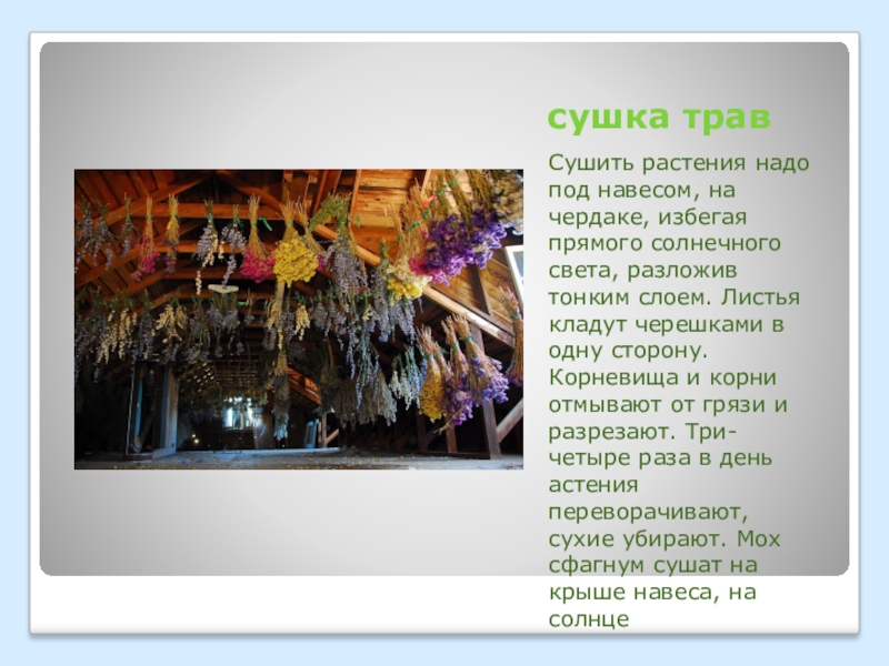 сушка травСушить растения надо под навесом, на чердаке, избегая прямого солнечного света, разложив тонким слоем. Листья кладут