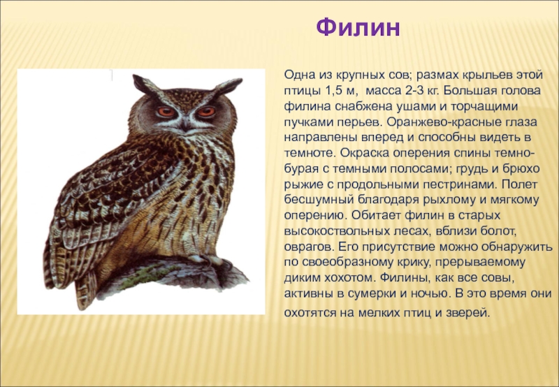 2-3 кг. Большая голова филина снабжена ушами и торчащими пучками перьев. Оранжево-красные глаза направлены вперед и способны видеть в темноте. Окраска оперения спины темно-бурая с темными полосами; грудь и брюхо рыжие с продольными пестринами. Полет бесшумный благодаря рыхлому и мягкому оперению. Обитает филин в старых высокоствольных лесах, вблизи болот, оврагов. Его присутствие можно обнаружить по своеобразному крику, прерываемому диким хохотом. Филины, как все совы, активны в сумерки и ночью. В это время они охотятся на мелких птиц и зверей.