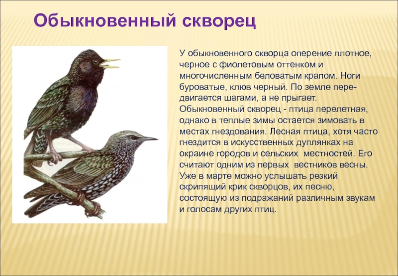 беловатым крапом. Ноги буроватые, клюв черный. По земле пере-двигается шагами, а не прыгает. Обыкновенный скворец - птица перелетная, однако в теплые зимы остается зимовать в местах гнездования. Лесная птица, хотя часто гнездится в искусственных дуплянках на окраине городов и сельских местностей. Его считают одним из первых вестников весны. Уже в марте можно услышать резкий скрипящий крик скворцов, их песню, состоящую из подражаний различным звукам и голосам других птиц.