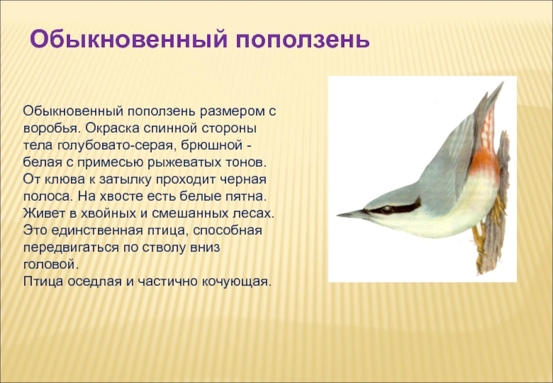 Слайд 4Обыкновенный поползень размером с воробья. Окраска спинной стороны тела голубовато-серая, брюшной