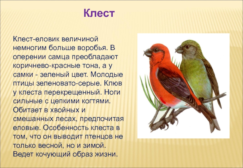 а у самки - зеленый цвет. Молодые птицы зеленовато-серые. Клюв у клеста перекрещенный. Ноги сильные с цепкими когтями. Обитает в хвойных и смешанных лесах, предпочитая еловые. Особенность клеста в том, что он выводит птенцов не только весной, но и зимой.