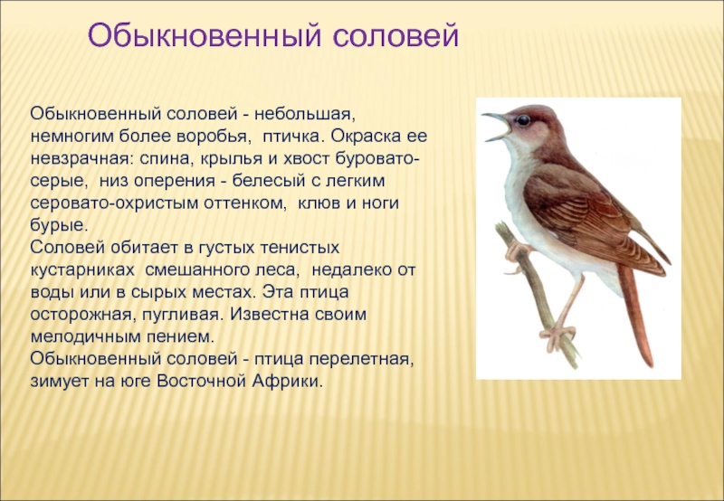 Слайд 14Обыкновенный соловей - небольшая, немногим более воробья, птичка. Окраска ее невзрачная: