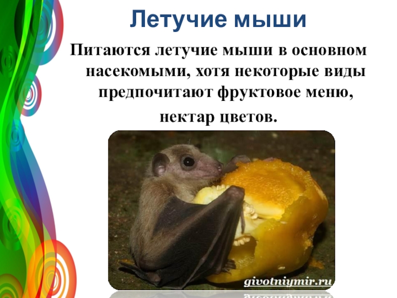 Питаются летучие мыши в основном насекомыми, хотя некоторые виды предпочитают