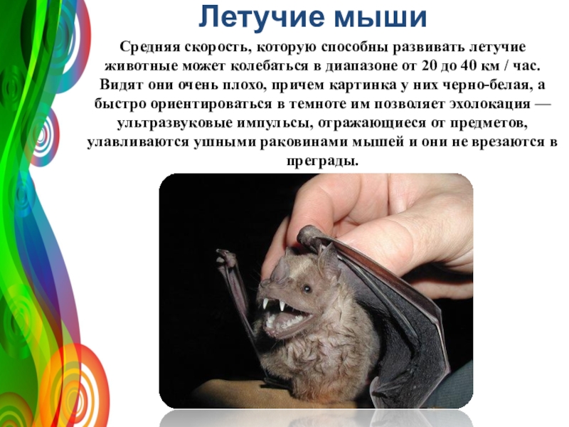 может колебаться в диапазоне от 20 до 40 км / час. Видят они очень плохо, причем картинка у них черно-белая, а быстро ориентироваться в темноте им позволяет эхолокация — ультразвуковые импульсы, отражающиеся от предметов, улавливаются ушными раковинами мышей и они не врезаются в преграды.