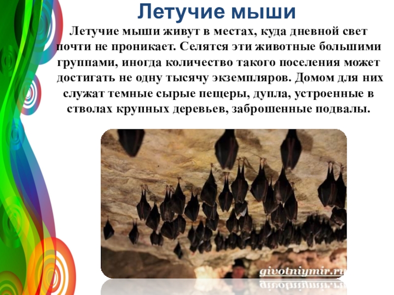 свет почти не проникает. Селятся эти животные большими группами, иногда количество такого поселения может достигать не одну тысячу экземпляров. Домом для них служат темные сырые пещеры, дупла, устроенные в стволах крупных деревьев, заброшенные подвалы.