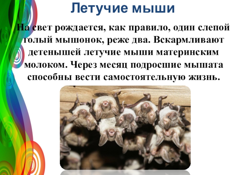 мышонок, реже два. Вскармливают детенышей летучие мыши материнским молоком. Через месяц подросшие мышата способны вести самостоятельную жизнь.