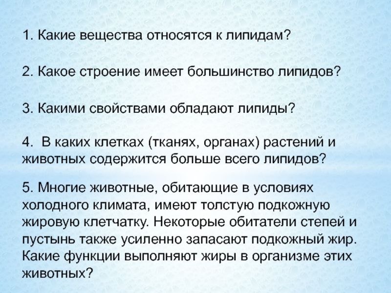 5. Многие животные, обитающие в условиях холодного климата, имеют толстую подкожную жировую клетчатку. Некоторые обитатели степей и пустынь также усиленно запасают подкожный жир. Какие функции выполняют жиры в организме этих животных?