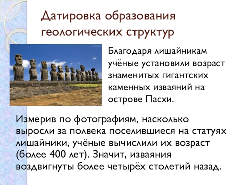 Измерив по фотографиям, насколько выросли за полвека поселившиеся на статуях лишайники, учёные вычислили их возраст (более 400 лет). Значит, изваяния воздвигнуты более четырёх столетий назад.