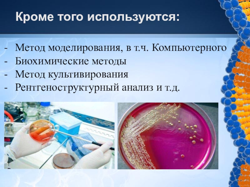 Кроме того используются:Метод моделирования, в т.ч. КомпьютерногоБиохимические методыМетод культивированияРентгеноструктурный анализ и т.д.