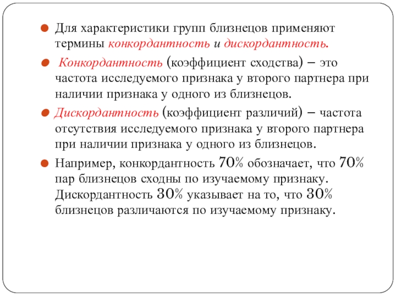 Например, конкордантность 70% обозначает, что 70% пар близнецов сходны по изучаемому признаку. Дискордантность 30% указывает на то, что 30% близнецов различаются по изучаемому признаку.