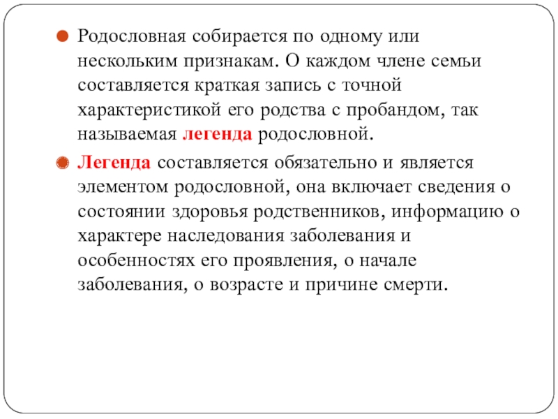 Легенда составляется обязательно и является элементом родословной, она включает сведения о состоянии здоровья родственников, информацию о характере наследования заболевания и особенностях его проявления, о начале заболевания, о возрасте и причине смерти.