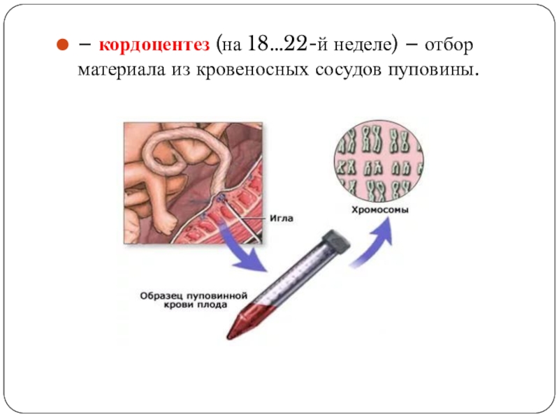 Слайд 39– кордоцентез (на 18…22-й неделе) – отбор материала из кровеносных сосудов
