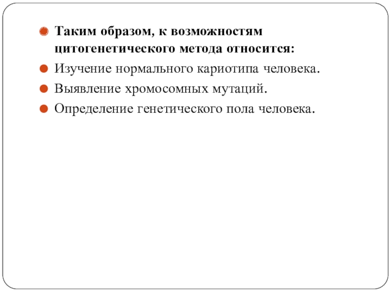 Слайд 28Таким образом, к возможностям цитогенетического метода относится: