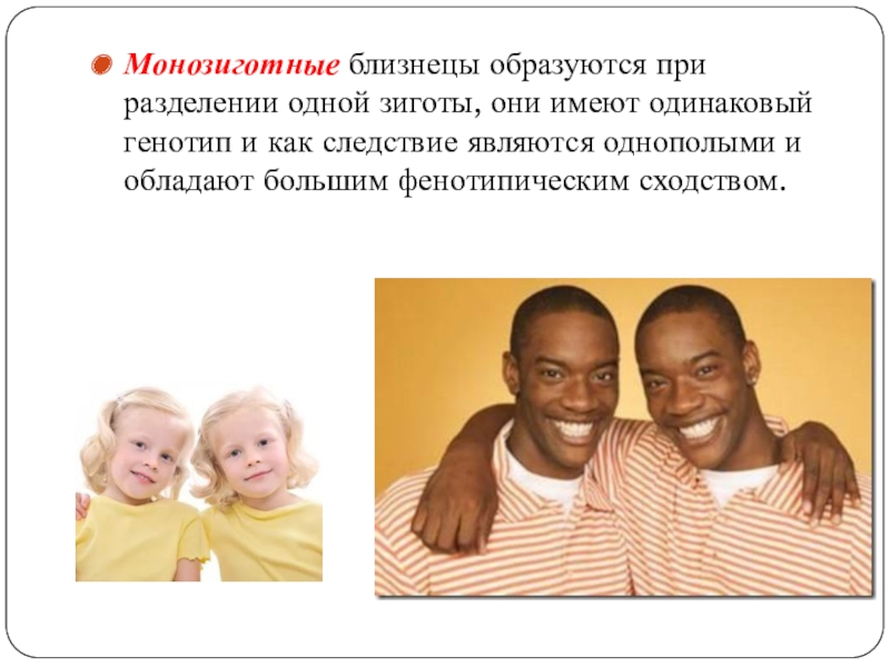 Слайд 22Монозиготные близнецы образуются при разделении одной зиготы, они имеют одинаковый генотип