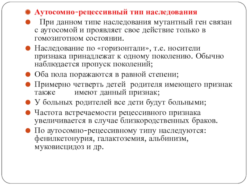 По аутосомно-рецессивному типу наследуются: фенилкетонурия, галактоземия, альбинизм, муковисцидоз и др.