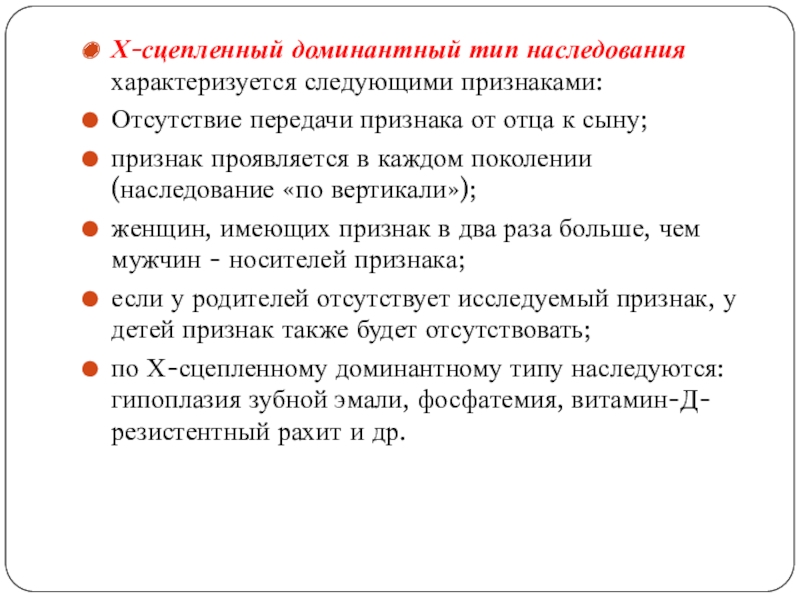 по Х-сцепленному доминантному типу наследуются: гипоплазия зубной эмали, фосфатемия, витамин-Д-резистентный рахит и др.