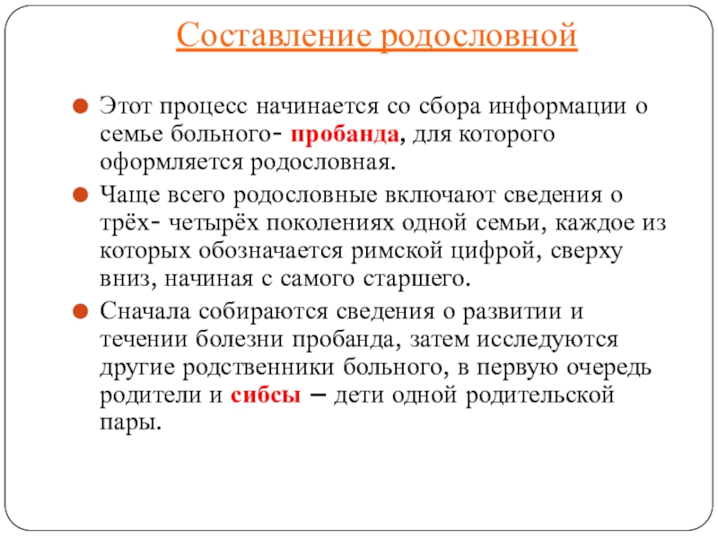 Сначала собираются сведения о развитии и течении болезни пробанда, затем исследуются другие родственники больного, в первую очередь родители и сибсы – дети одной родительской пары.