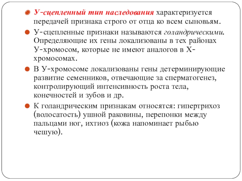 У-сцепленные признаки называются голандрическими. Определяющие их гены локализованы в тех районах У-хромосом, которые не имеют аналогов в Х-хромосомах.