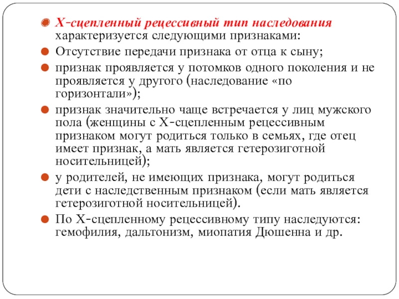 Слайд 17Х-сцепленный рецессивный тип наследования характеризуется следующими признаками: