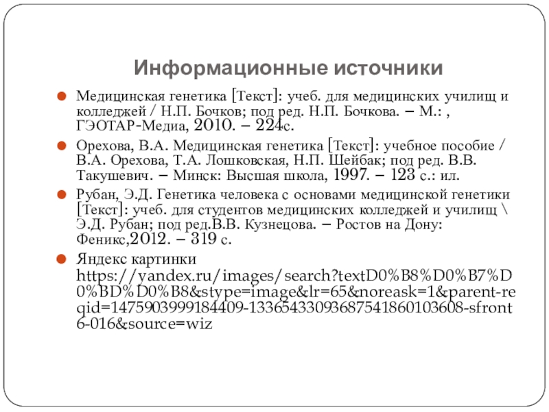 Орехова, В.А. Медицинская генетика [Текст]: учебное пособие / В.А. Орехова, Т.А. Лошковская, Н.П. Шейбак; под ред. В.В. Такушевич. – Минск: Высшая школа, 1997. – 123 с.: ил.