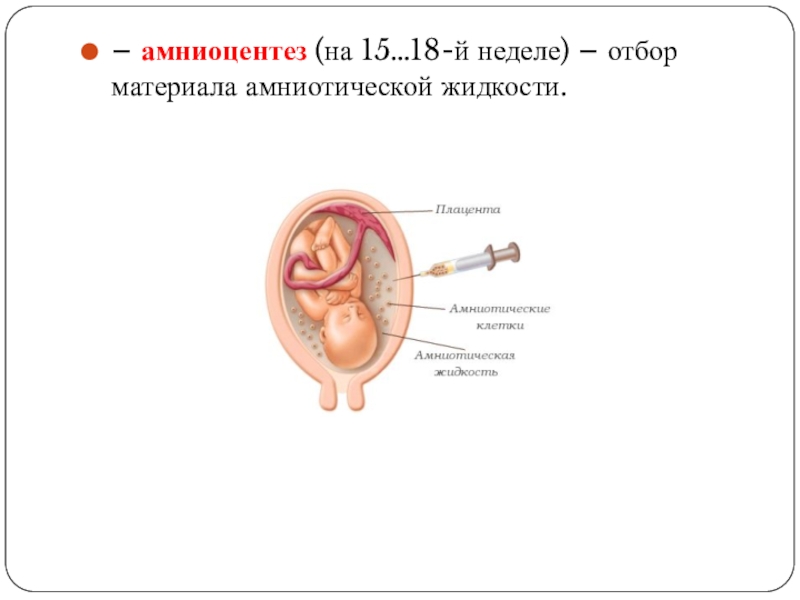 Слайд 38– амниоцентез (на 15…18-й неделе) – отбор материала амниотической жидкости.