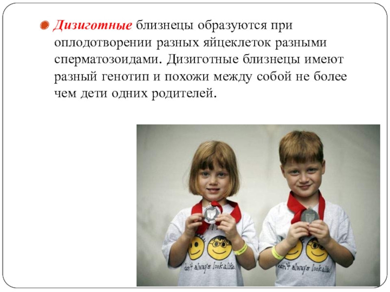 Слайд 23Дизиготные близнецы образуются при оплодотворении разных яйцеклеток разными сперматозоидами. Дизиготные близнецы