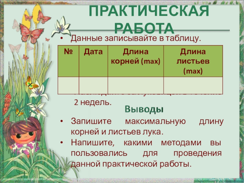 Запишите максимальную длину корней и листьев лука.