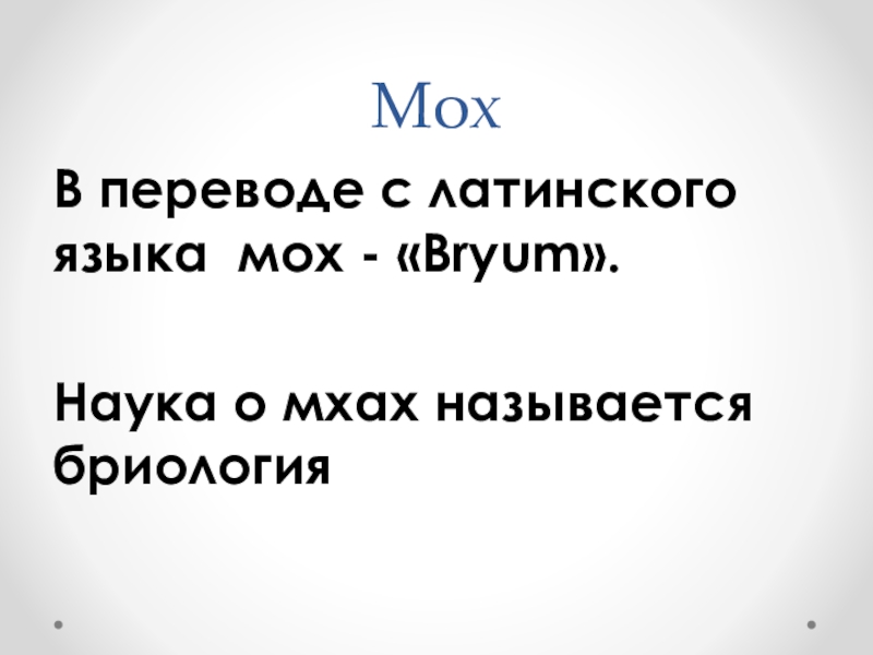 МохВ переводе с латинского языка мох - «Bryum».Наука о мхах называется бриология