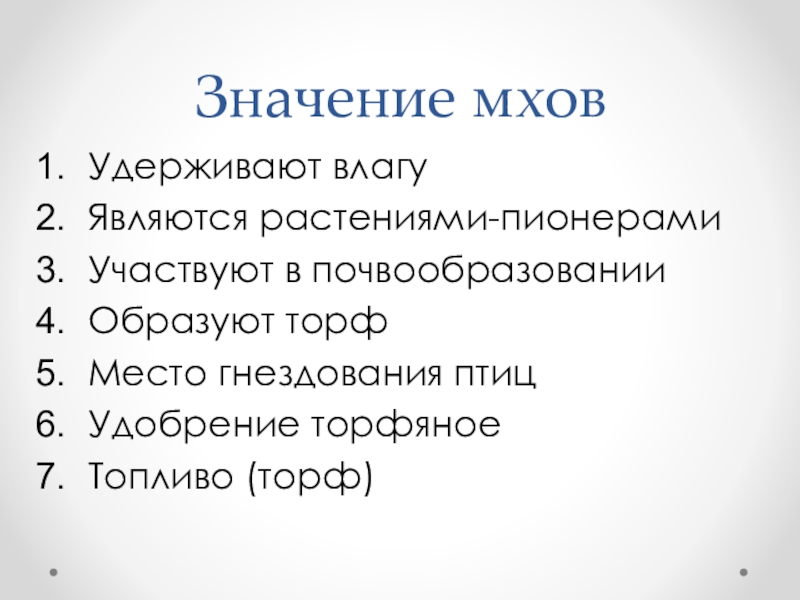 Значение мховУдерживают влагуЯвляются растениями-пионерамиУчаствуют в почвообразованииОбразуют торфМесто гнездования птицУдобрение торфяноеТопливо (торф)