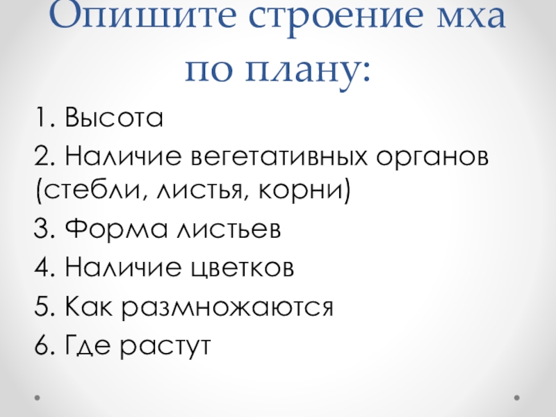 Опишите строение мха по плану:1. Высота2. Наличие вегетативных органов (стебли, листья, корни)3. Форма листьев4. Наличие цветков5. Как