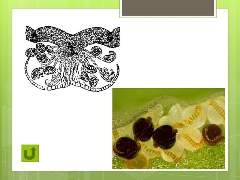 Слайд 42При бесполом размножении на нижней стороне листа образуются парные выросты — сорусы.
